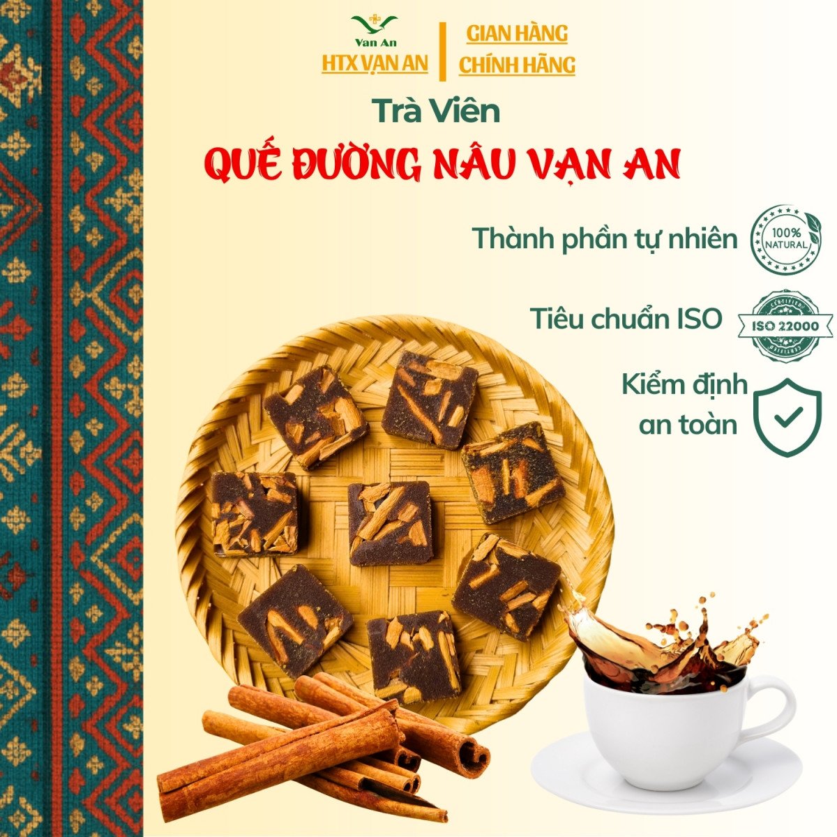Trà viên Quế Đường Nâu Vạn An là sản phẩm OCOP 3 sao của HTX Vạn An. Trà có nguyên liệu chính là quế bản địa đã đạt tiêu chuẩn và cấp chứng nhận hữu cơ với nhiều tinh chất có lợi cho sức khoẻ người sử dụng. Trà dạng viên tiện lợi, chỉ cần cho vào nước là có thể sử dụng.